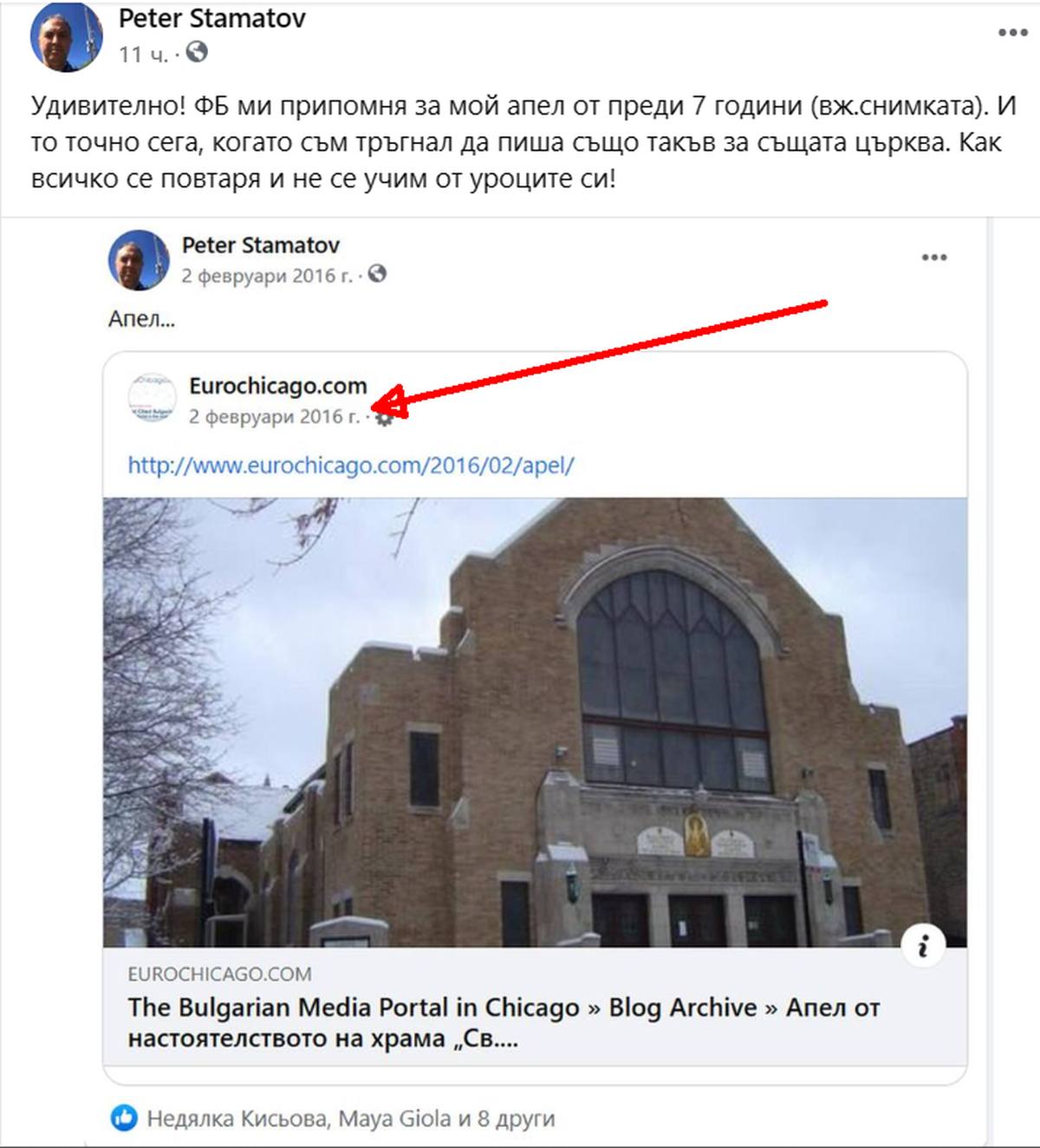 Вчера, 2 февруари 2023 г., точно когато започнах да пиша текст за състоянието на Българската православна църква в Чикаго „Св. Иван Рилски – Чудотворец “, Фейсбук ми припомни един апел за спасението на храма отпреди 7 години – цитирам го: