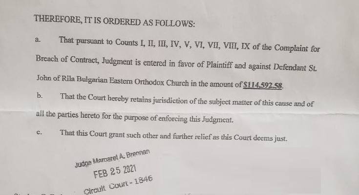 Казусът с този храм стигна до юридическо разрешение, когато на 20 юли 2012 г., след няколко отлагания и 7 години съдебни спорове, бе оповестено съдебното решение по делото за БПЦ “Свети Иван Рилски Чудотворец” в Чикаго. Според решението, „Св. Иван Рилски “ е легитимна българска източноправославна църква в САЩ, намираща се под йерархическото пълномощие на Архиепископа на Диоцеза на Толедо към Православната църква в Америка.