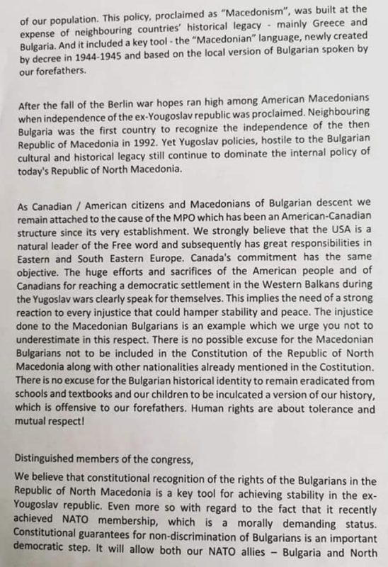 „МПО „Правда“ – Торонто очаква с нетърпение интеграцията на РС Македония в Европейския съюз. Оставаме с надеждата, че официалните институции в САЩ ще се намесят в работата на властите в РС Македония, за да ги насърчат да реформират наследената югославска държавна идеология и да гарантират политическите права и недискриминацията на македонското българско население, като по този начин покажат зачитане на основните демократични ценности в съответствие с новопридобитото членство на РС Македония в НАТО.“