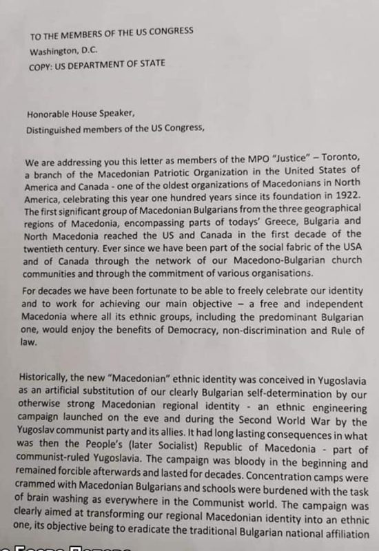 Цанко Серафимов напомня на стената си във Фейсбук за едно писмо на председателя на Македонската патриотична организация „Правда“ в Торонто, Канада, Александър Караджов, до Конгреса на САЩ.