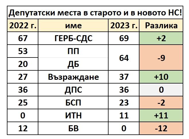 Разпределението на мандатите е следното: ГЕРБ-СДС получава 69 мандата. Това е с пет места повече от „Продължаваме Промяната – Демократична България”, която ще има общо 64 депутати. От „Възраждане” ще бъдат излъчени 37 народни представители. ДПС получава 36 мандата. Депутатите на БСП ще бъдат 23, а на „Има такъв народ” – 11.