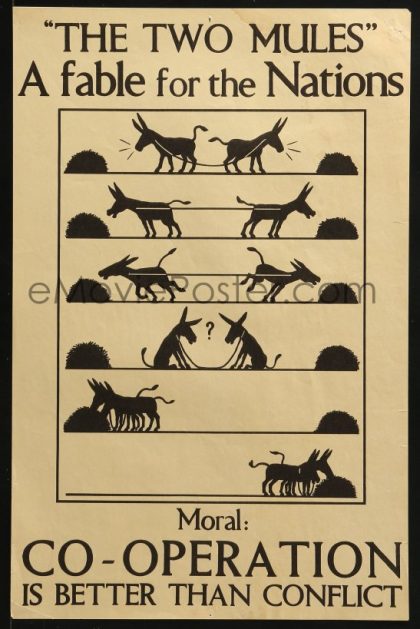 сътрудничеството е по-добро от конфликта. Когато те се опитват самостоятелно да достигнат до купчината сено, двете остават гладни, и двете губят (lose-lose solution). Когато седнат и размислят – без някой отвън да налага решението си (да призовават за диалог и коалиция) – те заедно достигат първо едната, после другата купчина сено и се нахранват. Така и двете мулета печелят (win-win solution).