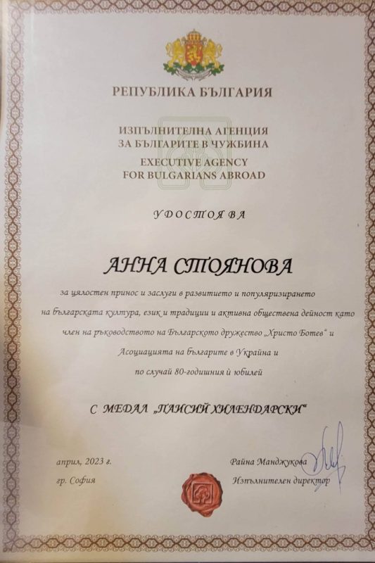 Анна Стоянова и днес е един от активните и неуморни радетели за българската кауза в Украйна.