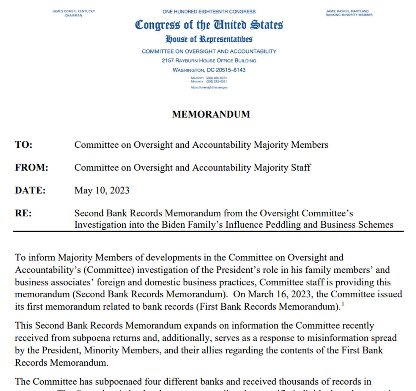 Републиканците в САЩ публикуваха доклад-меморандум от 36 страници, описващ подробно мрежата от LLC фирми на семейство Байдън и връзката им с компания, свързана с китайското разузнаване. Меморандумът, публикуван (вж. ЛИНК) от Комисията за надзор и отчетност на Камарата на представителите, се прицели в отричанията (при това многократни) на президента Джо Байдън, че е имал нещо общо с китайски пари.
