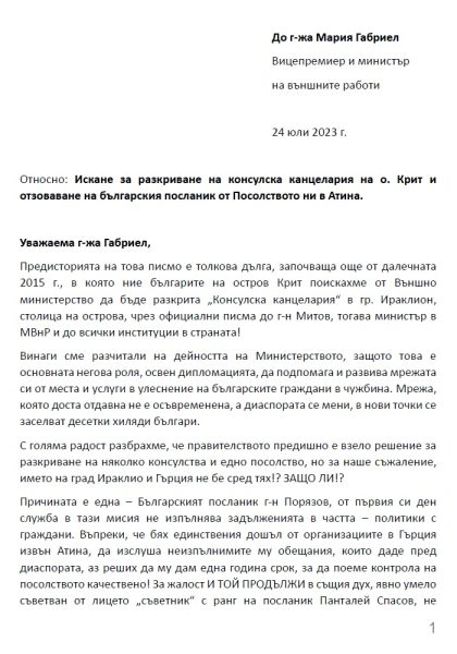Исканията, изложени в това писмо, са в услуга на българските граждани на острова, които са 15-20 хиляди,...
