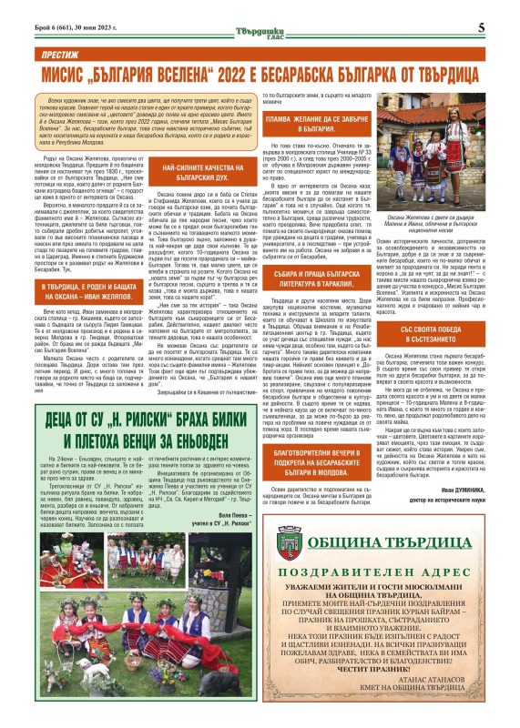 Главният герой на нашата статия е един от ярките примери, когато българско-молдовско смесване на „цветовете” довежда до поява на едно красиво цвете. Името й е Оксана Желяпова – тази, която през 2022 година спечели титлата „Мисис България Вселена”. За нас, бесарабските българи, това стана наистина историческо събитие, тъй както носителката на короната е наша бесарабска българка, която се е родила и израснала в Република Молдова.