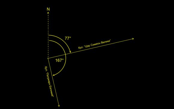 Геодезически азимути на бул. „Патриарх Евтимий“ при кръстовището: 167.0° (юг-югоизток) и 347.0° (т.е. –13.0°, север-северозапад). Забелязва се съвсем лека извивка на булеварда – вероятно заради по-късни корекции на бордюри, градинки и пр.