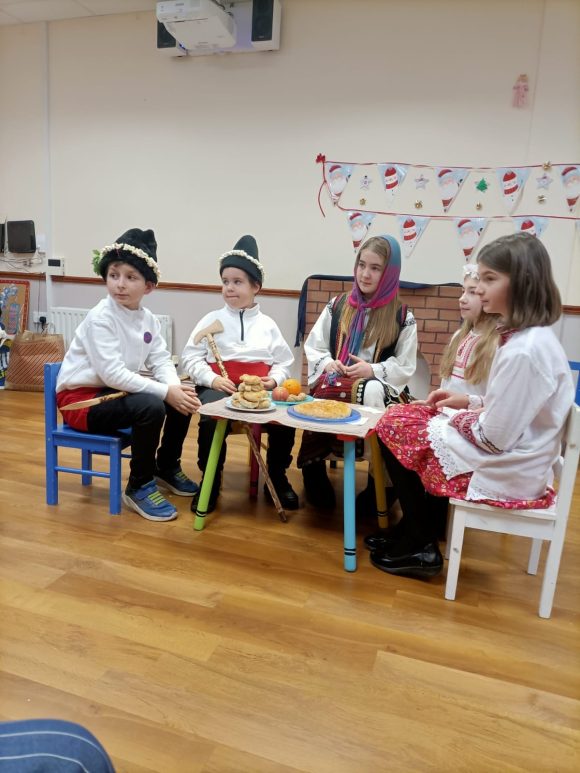 Пресъздадохме Бъднивечерската трапеза с питката, късметите, коледарите (те бяха зашеметяващо красиви – с шапките, гегите, краваите).