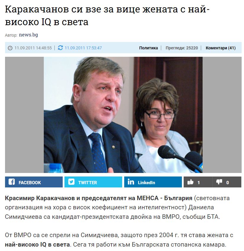 – Спорно е, защото това няма да оправи нещата. Дори всички политици да са с IQ над 150 и да са членове на МЕНСА, все тая. Е, важно е политиците да са минали поне 100-те точки, защото това е средното ниво на интелигентност. Друго обаче е е по-важно от IQ теста – да се изследва моралът на политиците, там е слабото им място. Но за съжаление не знам такъв метод. Алчността, егоизмът, котерийната борба е пагубна, карат те да се отвращаваш от политиката. Това е по-страшното, не толкова потенциалът за логично мислене на политиците, а моралът. И разбира се, да имат собствено достойнство, да не гласуват като роботи, под команда, водени от партийни интереси. Както знаем, когато у нас не става въпрос за пари, става въпрос за много пари.