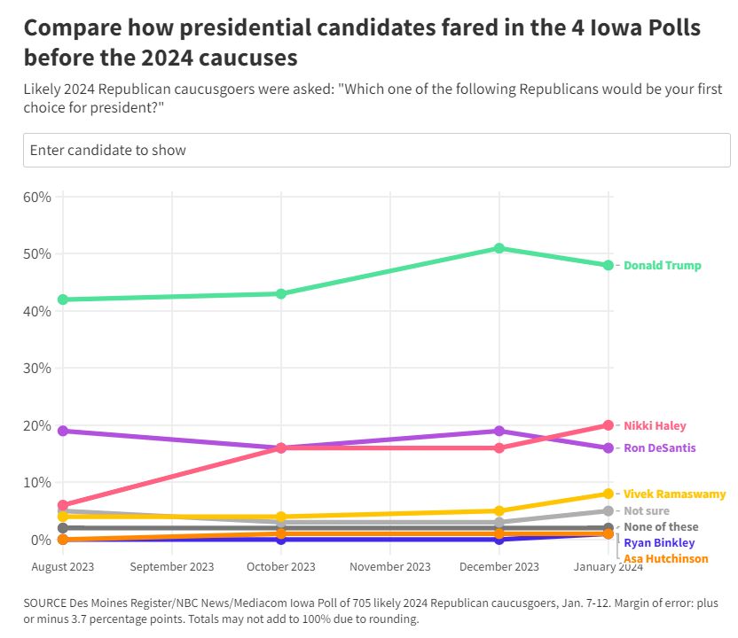 Вижте какво показваше последното проучване преди днешните изборни събрания в Айова. Фаворит бе Доналд Тръмп с 48%, на второ място бе поставена, след огромно медийно внимание, Ники Хейли с 20%.
