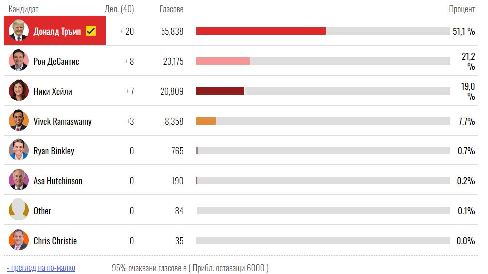 По-напрегната бе битката за второто място между бившия посланик в ООН Ники Хейли и губернатора на Флорида Рон ДеСантис. Те трябва да докажат кой от двамата е по-вероятно да успее да попречи на Тръмп да спечели мнозинство.