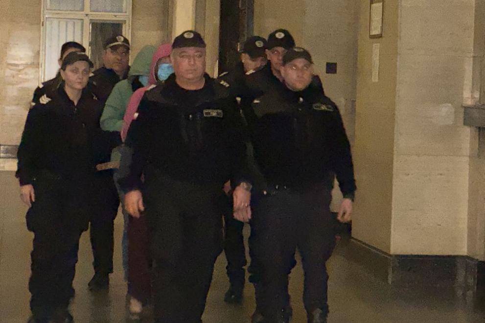 Двете жени, арестувани за убийството на Пейо Пеев, заедно с полицаи, които ги водят.