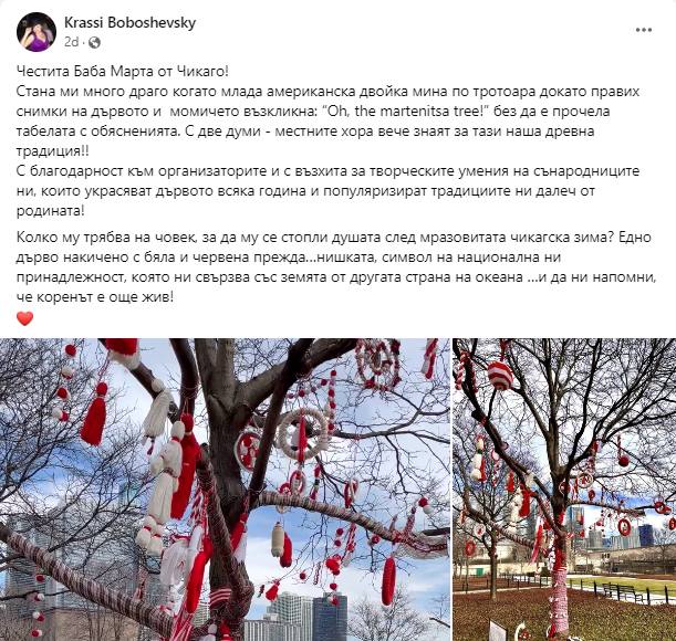 “Честита Баба Марта от Чикаго! Стана ми много драго, когато млада американска двойка мина по тротоара, докато правих снимки на дървото, и момичето възкликна: “Оh, the martenitsa tree!”, без да е прочела табелата с обясненията. С две думи – местните хора вече знаят за тази наша древна традиция!