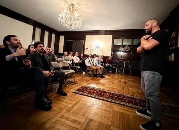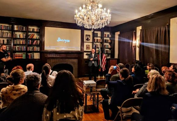 Генералният консул Ангел Ангелов приветства гостите и им представи режисьорa Николай Василев, който вече е познат на общността ни в Ню Йорк от прожекцията през 2022 г. на филма му „Формулата на Тео“, поветена на забележителния български учител по физика Теодосий Теодосиев.