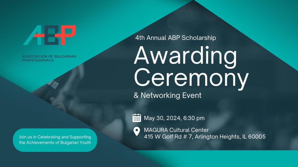 Асоциацията на българските професионалисти (Association of Bulgarian Professionals /ABP), която е базирана в Чикаго, кани на събитие за връчването на стипендии на български студенти. Датата е 30 май 2024 г., от 6:30 pm, мястото на събитието – Културен център „Магура“ (415 W. Golf Rd.#7, Arlington Heights, IL, 60005).