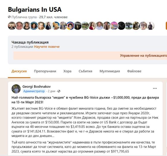 Georgi Boshnakov: „Най-голямата българска “медия” в чужбина BG-Voice дължи ~$1,000,000, преди да фалира на 13-ти март 2023! Жълтият вестник BG-Voice е обявил фалит миналата година, без да сметне за необходимост да уведоми своите читатели и рекламодатели…“