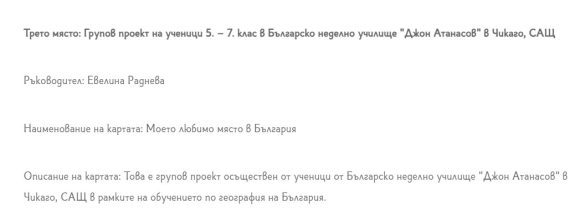 Груповият проект „Моето любимо място в България“ на ученици от БУ „Джон Атанасов“ с ръководител Евелина Раднева е изработен в часовете по география и икономика. Националният картографски конкурс е за ученици и студенти, а нашите млади картографи от 5-ти до 7-ми клас успяха да преборят сериозната конкуренция.
