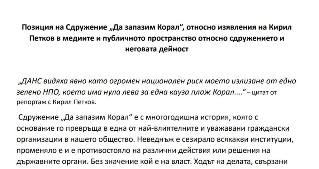 Сдружение „Да запазим Корал“ изпрати до български медии позиция, относно изявления на Кирил Петков в публичното пространство, касаещи сдружението и неговата дейност. В позицията се казва:
