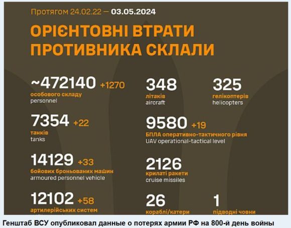 Генеральный штаб Вооруженных сил Украины 3 мая 2024 года опубликовал новые данные о потерях российской армии в ходе боевых действий на украинской территории (с 24 февраля 2022 года). Идет 800-й день войны, учтены данные за предыдущий день.