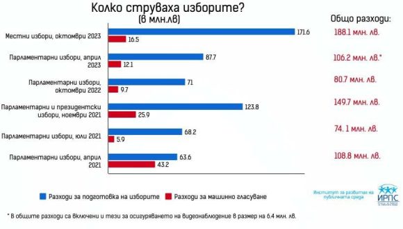 Като стана дума за пари, ето първо информация колко избори са проведени през 2021–2024 г. в България: общо 8 избори – 6 за НС, един за президент и вицепрезидент и един местен вот. Данните (2021–2023) на Института за развитие на публичната среда (ИРПС) показват, колко милиона лева са изразходени за изборите през тези 3 години, показано на графиката:
