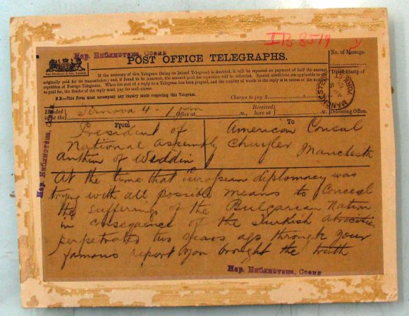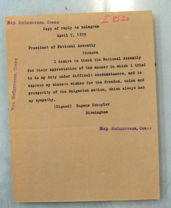 Текстът на телеграмата до Юджийн Скайлър гласи: „По времето, когато европейската дипломация опитваше с всякакви средства да прикрие страданията на Българската нация следствие от турските жестокости, извършени преди две години, чрез Вашия прочут доклад, Вие извадихте истината на светло и помогнахте да се поправи злото. Свободната Българска нация бърза да Ви благодари сърдечно за Вашето велико дело и да Ви увери, че Вашето име ще заeма видно място в историята на Освобождението на нашата нация.“