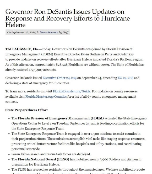 Много добра организация на ДеСантис и всички под него, и отлично поведение на Гражданите. Пиша Гражданите с главна буква, понеже не чух нито един да се жалва къде е държавата или да пита кога ще му купят нов телевизор в къщата, която не е застраховал. Всеки човек знае, че спасението е негово лично дело и никой не му е длъжен. Много хора през последната година са се отказали от застраховки, понеже те станаха много високи след предишните урагани (от 2500$ до 20 000$ на година на къща !!!), но сега знаят, че ще трябва да се оправят сами, за съжаление, а не да плачат на държавата. Общество. Имаш задължения, имаш права, имаш отговорности. Така са американците и управляващите във Флорида, от които някои българи много има да учат.