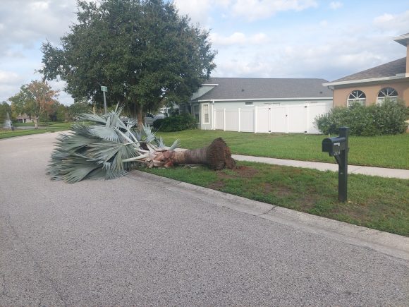 Нас, понеже сме на 20-25 мили навътре от океана, почти не ни засегна – много вятър, малко дъжд, но още преди да стигне северните части на щата, тук бе спряло. Останаха малко счупени клони и тук-таме дървета, като палмата на съседа, която виждате на снимката.