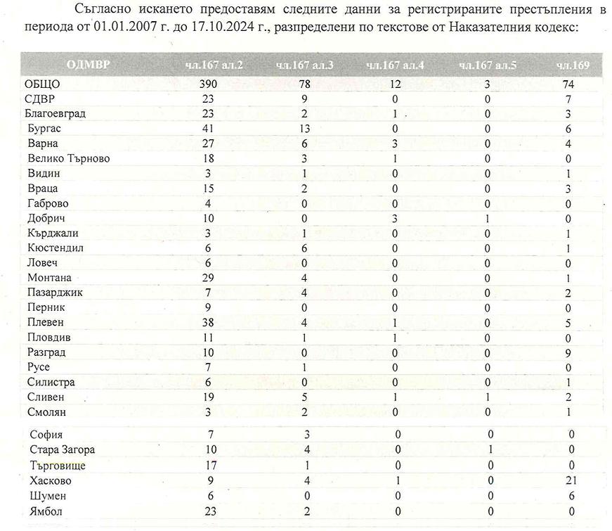 От своя страна МВР ни изпратиха също отговор по изпратеното заявление по ЗДОИ. Той е за регистрираните престъпления в периода от 01.01.2007 г. до 17.10.2024 г., разпределени по текстове от Наказателния кодекс, които са съответно по чл. 167, ал. 2 – 5 от НК (за купуването за гласове и др.) и с престъпления по чл. 169 от НК (за манипулиране на изборните резултати от членове на избирателни комисии).
