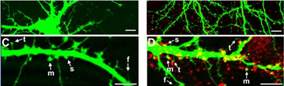 14. As you know, the neurons possess two types of projections: an axon and many dendrites (Greek, dendron – “tree”). The surface of dendrites are covered with „buds“ named dendritic spines (illustrated in the micrographs shown below) – they are bona fide very dynamic (“dancing”) structures of brain synapses pivotally involved in the process of cognition: