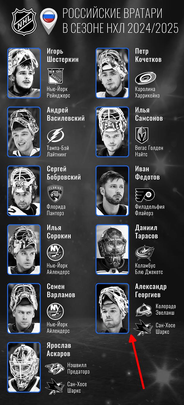 <Всего к середине нынешнего сезона в составе клубов НХЛ на льду появлялись 11 российских голкиперов, и это близко к прошлогодней рекордной цифре — 13. Если исходить из того, что каждая из 32 команд лиги вносит в заявку трех голкиперов, то каждый восьмой-девятый хоккеист в этом списке — россиянин. В списке также есть Александр Георгиев, который родился в Болгарии и является наполовину болгарским гражданином.