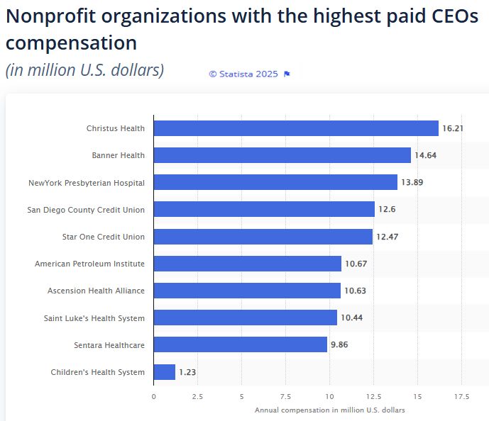 И още един факт, който прави впечатление в последните години (вж. следващите две снимки). Много от благотворителните намерения на тези организации са насочени не само към широката общественост, но… и към техните висши ръководители. Например, през 2021 г. главният изпълнителен директор на New York-Presbyterian Hospital беше компенсиран с приблизително 12,4 милиона долара.