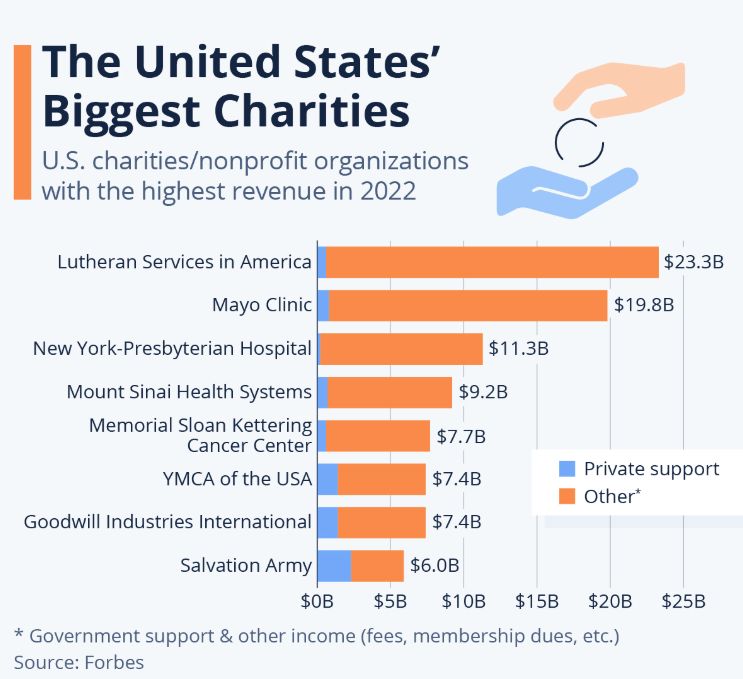 С приходи от 23 милиарда долара през 2022 г. Lutheran Services в Америка оглавява списъка на най-печелившите нестопански организации в Съединените щати, според анализ на Forbes. Следващите две са здравни организации, а именно Mayo Clinic и New York-Presbyterian Hospital, с приходи съответно от приблизително 20 милиарда долара и 11 милиарда долара. Трябва да се отбележи, че четири от първите 8 нестопански организации са свързани със сектора на здравеопазването, като третият и четвъртият участник са Mount Sinai Health Systems и Memorial Sloan Kettering Cancer Center.