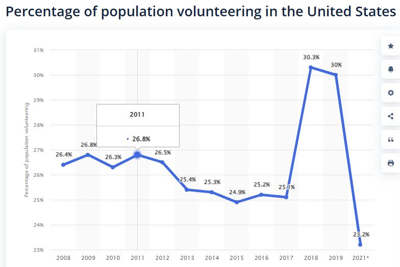 Своя труд даряват като доброволци повече от 20% от американците – вж. следващата графика (за съжаление не намерихме данни за след Ковид-19).