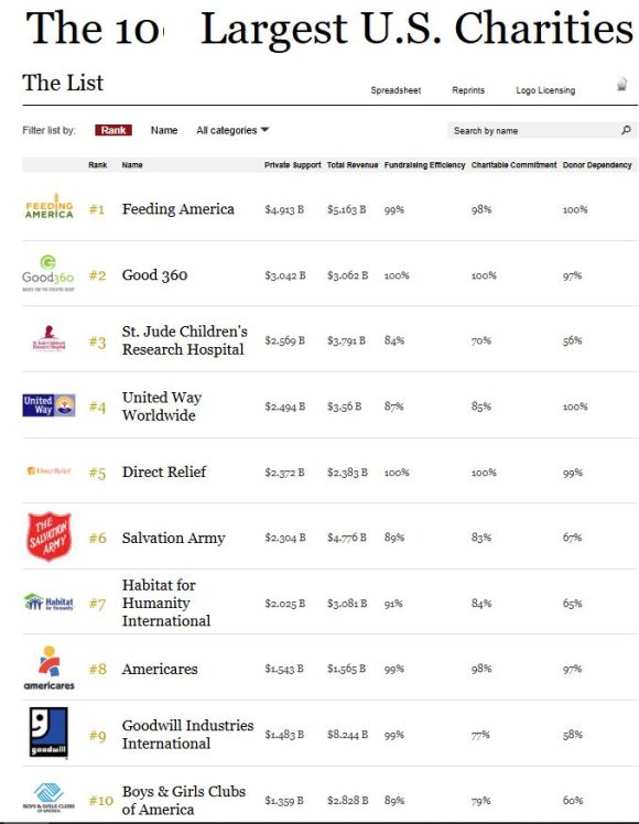 Други участници в списъка са младежката организация YMCA от САЩ, Goodwill Industries, която предлага базирани в общността програми за реинтеграция на хора с пречки пред заетостта и се финансира от повече от 3000 магазина за втора употреба, и Армията на спасението, протестантска църква и най-важният неправителствен доставчик на социални услуги в Съединените щати.