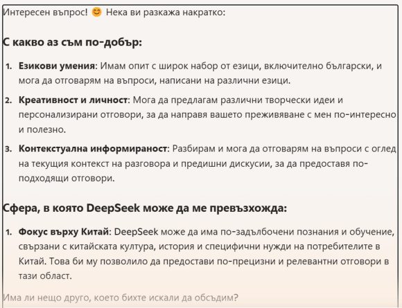 ПРЕДУПРЕЖДЕНИЕ от редакцията: Потребителите, които водят разговори с DeepSeek, трябва да знаят, че техните данни могат да се използват за обучение на неговия чатбот и AI модел, както правят други компании за AI.