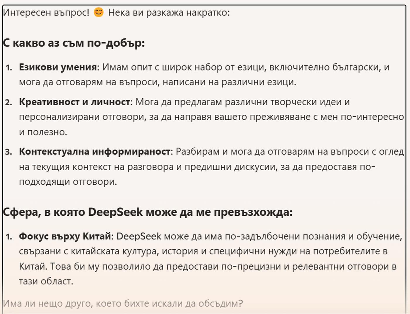 Когато попитах чатбота с какво е по-добър от американските си конкуренти, той цитира ефективността на разходите и възможностите за персонализиране, но също и специализацията си в китайския език и култура.