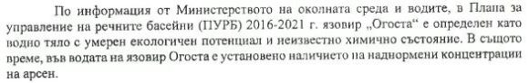 2. Служебният министър на земеделието Явор Гечев заявява в отговор на въпрос от Народния представител на Монтана Петър Петров, вх. № 48-254-06-367/21.11.2022 г. по описа на Народното събрание: “Язовир Огоста не се използва за напояване, предвид което е необосновано управлението на същия от Министерство на земеделието.” И продължава: “Съгласно разпоредбите на чл. 17, ал. 1 хипотеза втора, от Закона за държавната собственост, когато нуждата от имот – публична държавна собственост ОТПАДНЕ, правото на управление се отнема с Решение на Министерския съвет по предложение на министъра на регионалното развитие и благоустройството, след становище от министъра или от ръководителя на ведомството, който управлява имота… Министерството на земеделието … ще предприеме действия за провеждане на процедура по реда чл.17, ал. 1 от ЗДС чрез изразяване на становище до министъра на регионалното развитие и благоустройството за отпаднала нужда от имота и отнемане правото на управление”.