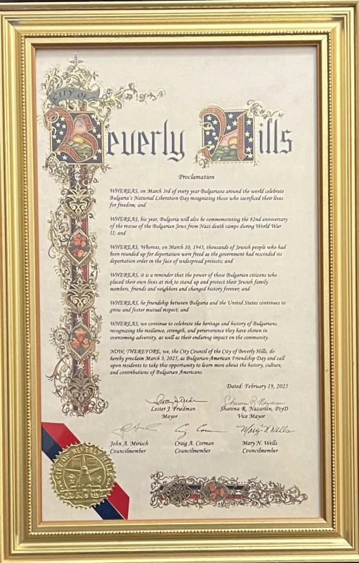 Кметът на града, г-н Лестър Фридман, заместник-кметът, Dr. Sharona Nazarian, и общинските съветници връчиха на официална церемония на генералния консул на България в Лос Анджелис, г-н Бойко Христов, прокламация, с която Трети март се обявява за Ден на приятелството между България и САЩ в Бевърли Хилс.