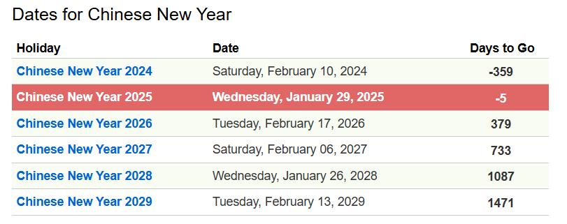 По този начин, Нова година според източния календар няма фиксирана дата; всяка година празникът се празнува на различни дати между 21 януари и 21 февруари. През 2025 г. китайската Нова година започна на 29 януари и е годината на змията , а ще продължи до 16 февруари 2026 г.