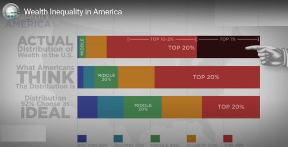 Но не само преди 140 години е било така. Днес не е по-различно. Вижте следващата илюстрация, като най-горе е посочено актуалното, реално положение в САЩ, при което 1% от населението притежава над 25% от цялото богатство в САЩ, а топ 20% – над 84 %. В средата на таблицата е положението, както хората си го представят или каквото чуват от медиите, а най-долу е посочен идеалния вариант според автора, за това как би трябвало да бъде разпределението на богатството в евентуалното светло бъдеще.