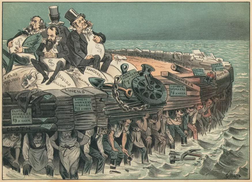 По-горе виждате политическа карикатура от 1883 г., насочена към конкретни исторически личности. На нея са изобразени богатите бизнесмени Сайръс Фийлд (1819–1892), Джей Гулд (1836–1892), Корнелиъс Вандербилт (1794–1877) и Ръсел Сейдж (1816–1906). Работниците, залети в морето от тежки времена, се борят да задържат на гърба си индустриите за дървен материал, хартия и лен с нископлатени работни места, докато индустриалците и техните милиони ги смачкват. (Кредит: STOCK MONTAGE/GETTY IMAGES).