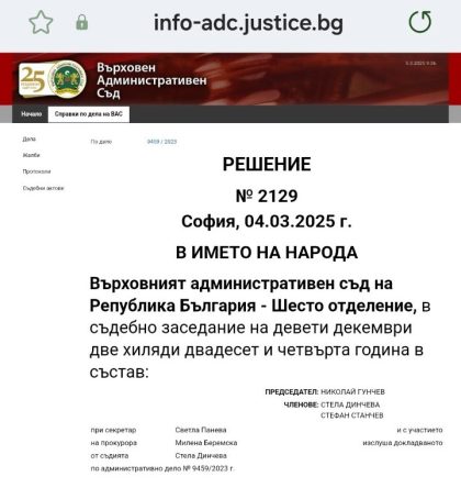 Излезе дългоочакваното решение на Върховния административен съд (ВАС) по адм. дело № 9459/2023 г. за инсталацията за...