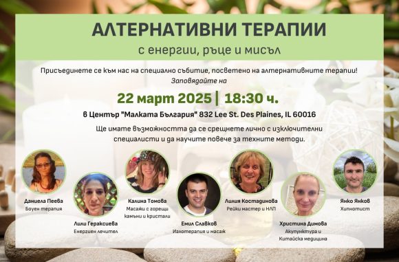 Гост-лектори ще бъдат наши сънародници от Чикаго, които се занимават с различни алтернативни лечебни методи (боуен и иглотерапия, акупунктура, китайска медицина, рейки и др.). Вход свободен.
