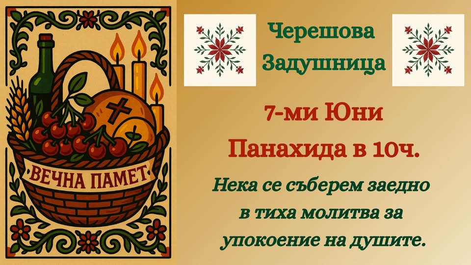 Българската църква „Света Троица“ (Holy Trinity Bulgarian Church) в Мадисън, Илинойс, кани всички желаещи сънародници на 7 юни, събота, от 10:00 часа, на панихида за Черешова задушница.