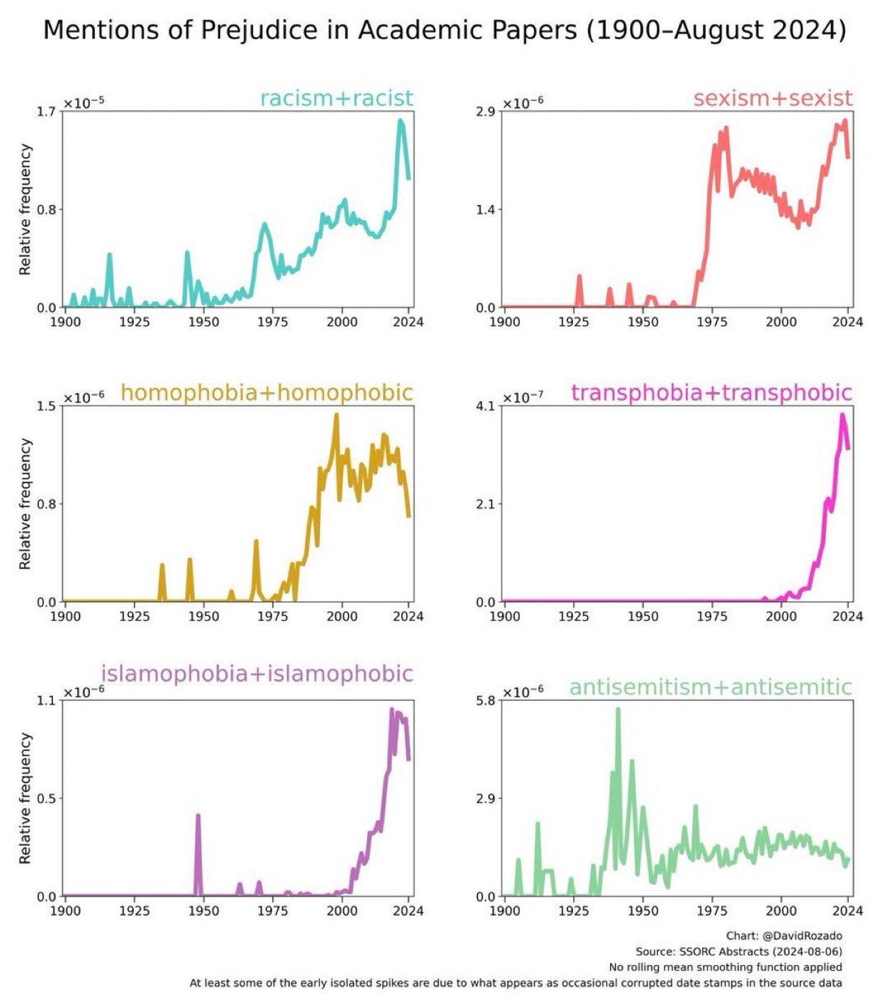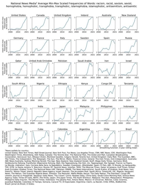 Анализ по години на това колко често се използват посочените по-долу думи в националните новинарски медии – расизъм, расист, сексизъм, сексист, хомофобия, хомофобски, трансфобия, трансфобски, ислямофобия, ислямофобски, антисемитизъм, антисемитски. Първата таблица посочва положението в САЩ, втората – в света, третата – в научните издания.