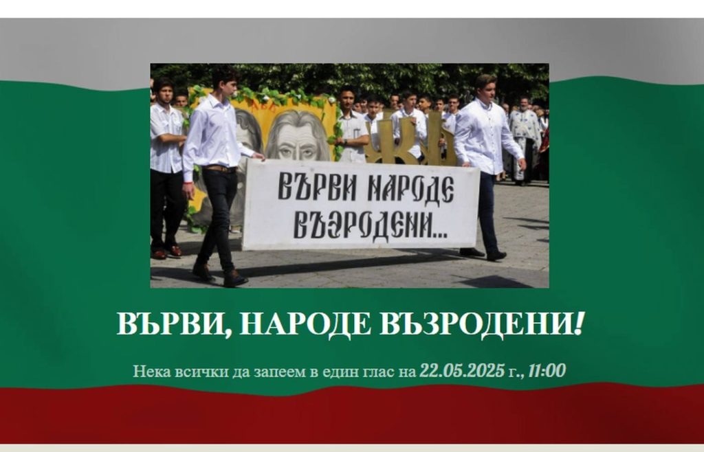 Както вече съобщихме (вж. тук), на 22 май 2025 г., от 11 часа българско време, ще се проведе събитие под надслов “Върви, народе възродени!”. Инициаторите за събитието канят всички сънародници в страната и по света, имащи желание и възможност, да се включат в тази инициатива.