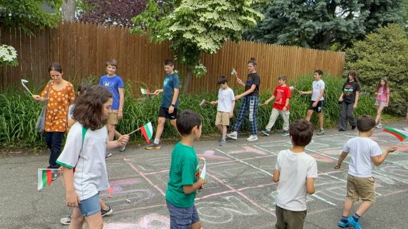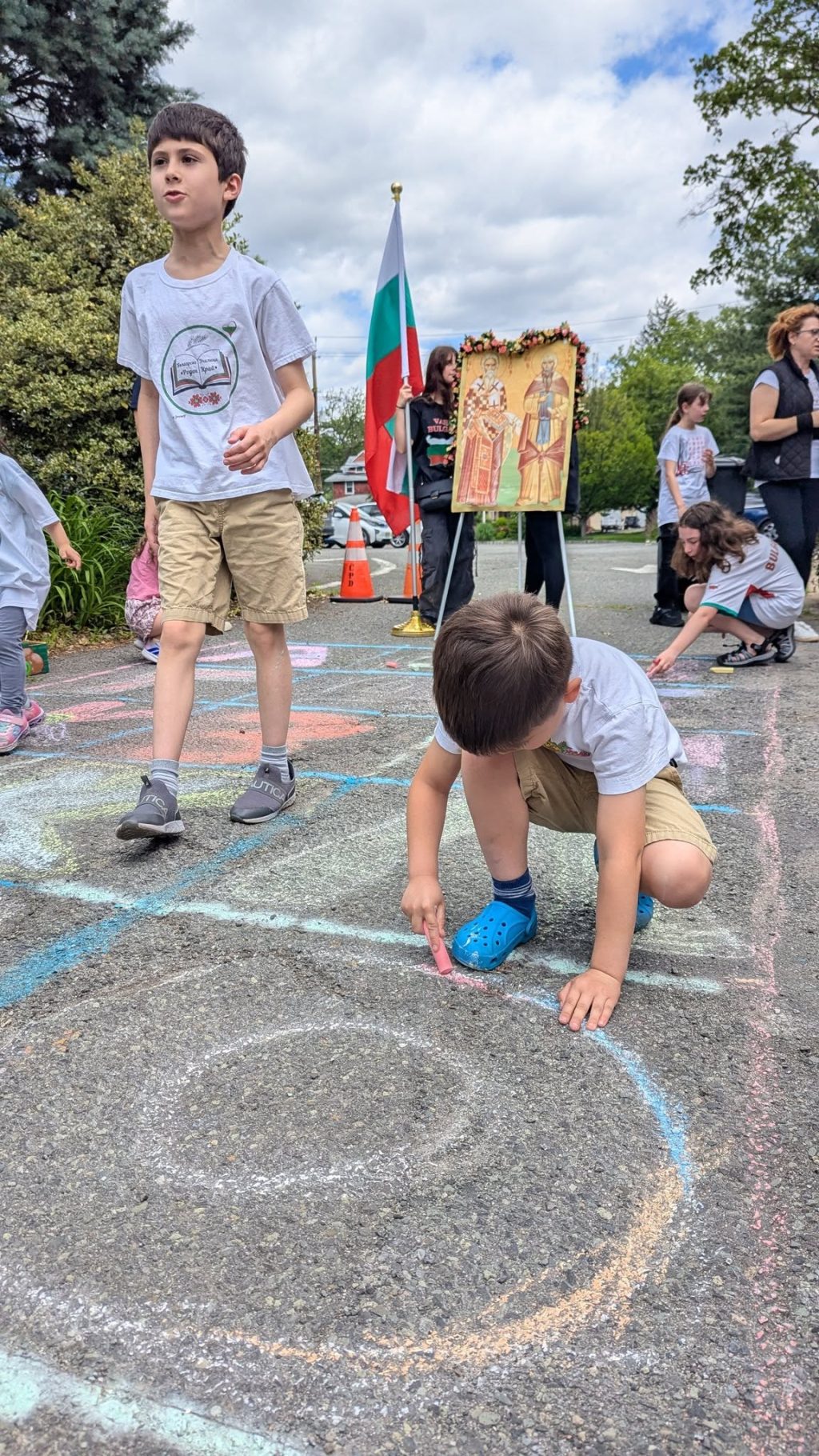 Част от празничната програма тази година включи цветното изписване на българската азбука в двора на училището. С тебешир в ръка учениците сътвориха пъстър килим от 30-те знака на българската азбука.