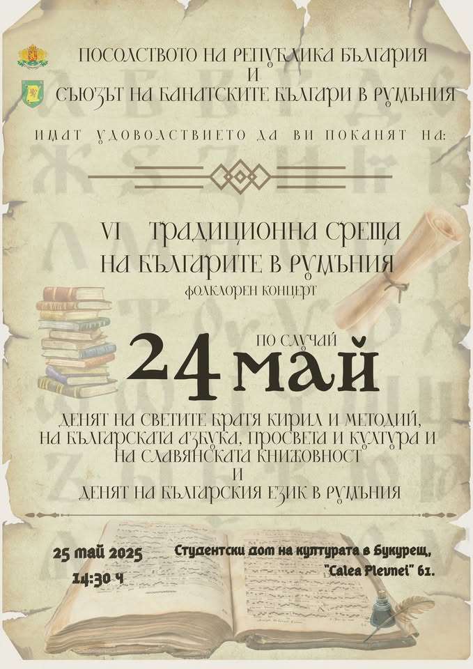 Тазгодишната традиционна среща на българите в Румъния по случай 24 май – Ден на българската азбука, просвета и култура и славянската писменост, който е и Ден на българския език в Румъния, ще се състои в Студентския дом на културата в Букурещ / Casa de Cultură a Studenților din București (Calea Plevnei 61, sect.1). По време на празничното събитие ще бъде изнесен фолклорен концерт.