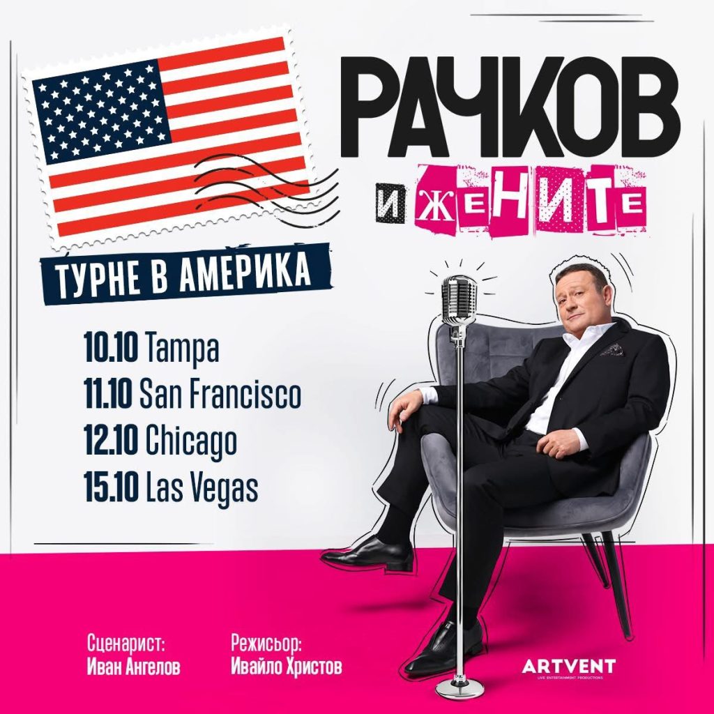 – Димитър Рачков за първи път пристига в САЩ! Очаквайте „Рачков и жените“ през октомври. В Тампа (10 октомври), Сан Франциско (11 октомври), Чикаго (12 октомври) и Лас Вегас (15 октомври).