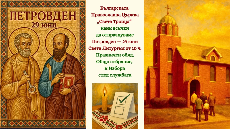 Българската православна църква „Св. Троица“ (Bulgarian Church Holy Trinity) в Мадисън, Илинойс, кани своите членове, както и всички желаещи сънародници тази неделя, 29 юни, на Света литургия в деня на Светите първоапостоли Петър и Павел – Петровден. След светата служба ще има общо събрание, както и избори за нови църковни настоятели.